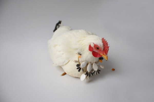 Parures avec transposition de graines en joyaux, pour poules et autres volatiles. Réalisées dans le cadre d'une vidéo collective avec les étudiants de l'atelier bijou de l'ESADS : Tierparade pour une exposition à l’institut français de Münich, inscrit dans le parcours off de la Schmuck 2011.graines (maïs, tournesol, courge) et laiton, photographies, dimensions variables, 2011