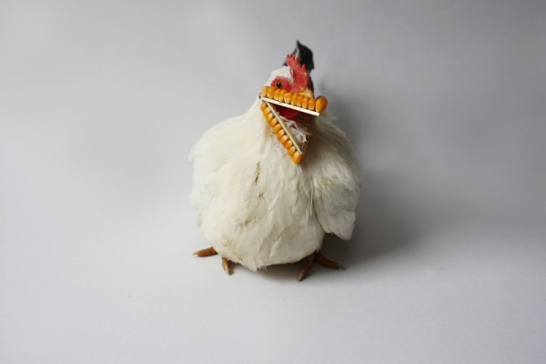 Bec de poules armé de dents. Réalisé dans le cadre de la vidéo Tierparade pour une exposition à l’Institut français de Münich, Allemagne - parcours off de la Schmuck 2011.maïs et laiton, 5 x 5 x 3 cm, 2011